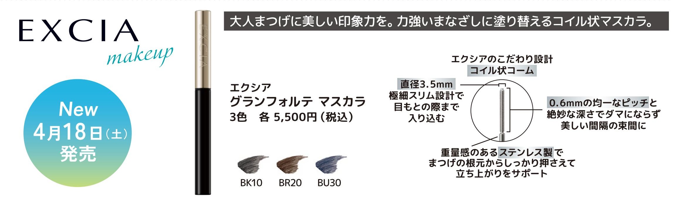 まつげを美しく立ち上げ、存在感のある目もと印象に仕上げるコイル状コームのマスカラです。