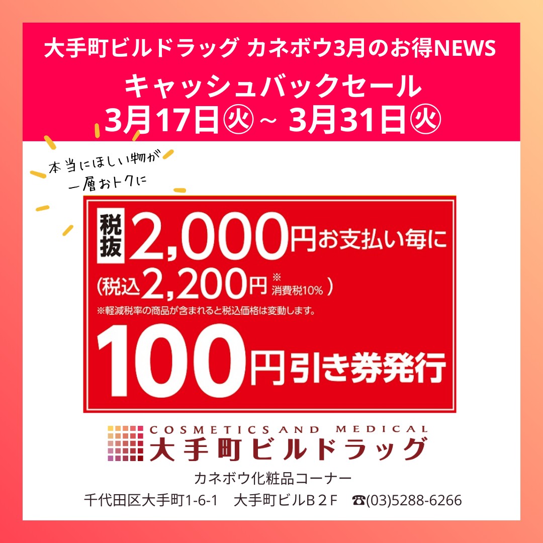こんにちは、大手町ビルドラッグ店カネボウからのお知らせです。
