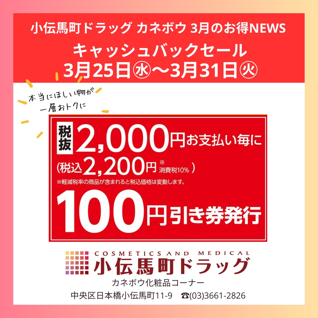 小伝馬町ドラッグ店カネボウコーナーからのお知らせ