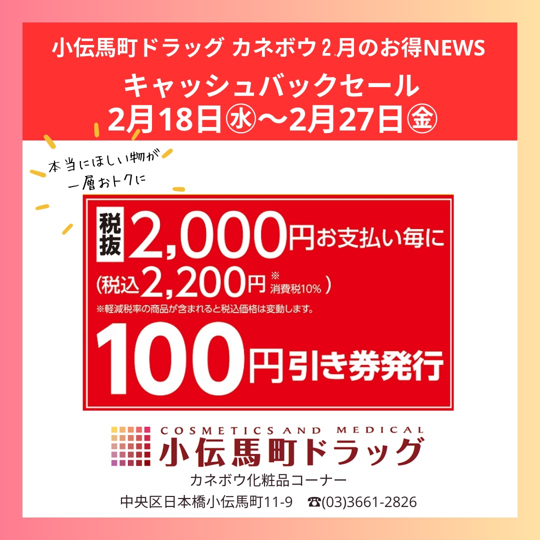 こんにちは、小伝馬町ドラッグ店カネボウからのお知らせです。