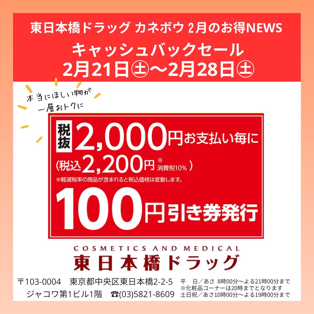 こんにちは、東日本橋ドラッグ店カネボウからのお知らせです。