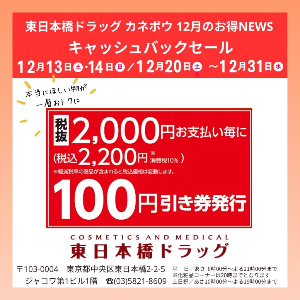 こんにちは、東日本橋ドラッグ店カネボウからのお知らせです。