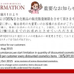2015/07/23 / 最終更新日 : 2015/07/27 COSMETICS-MEDICAL 8月1日よりコスメ特売商品の販売数制限を実施させて頂きます。 8月1日より転売目的と思われるお客様対策としてコスメ特売商品の販売数制限を実施させて頂きます。 8月より 以下の方法にて統一させて頂きます。 ●購入点数の制限 35%~30%オフコスメに限り 1回のお買いものでお1人様各 […]
