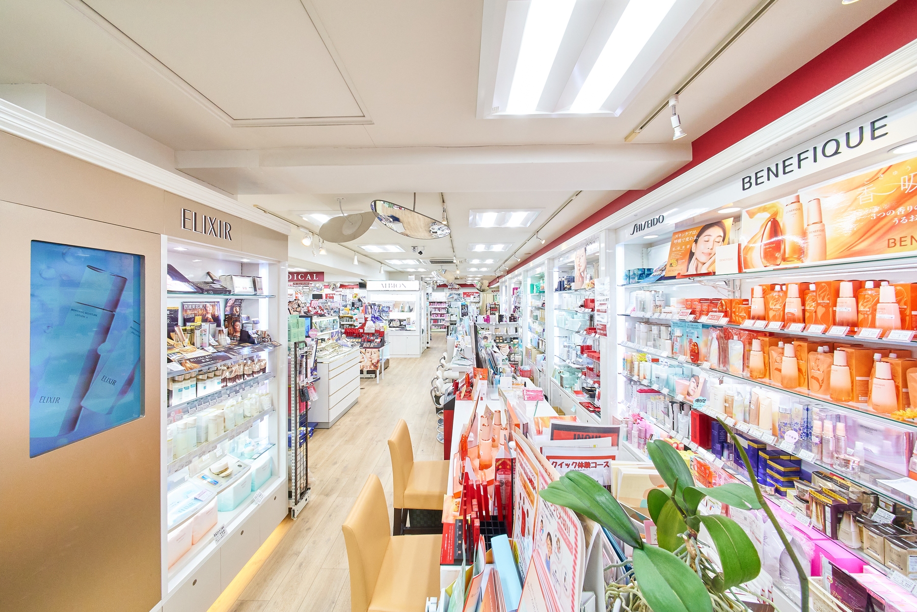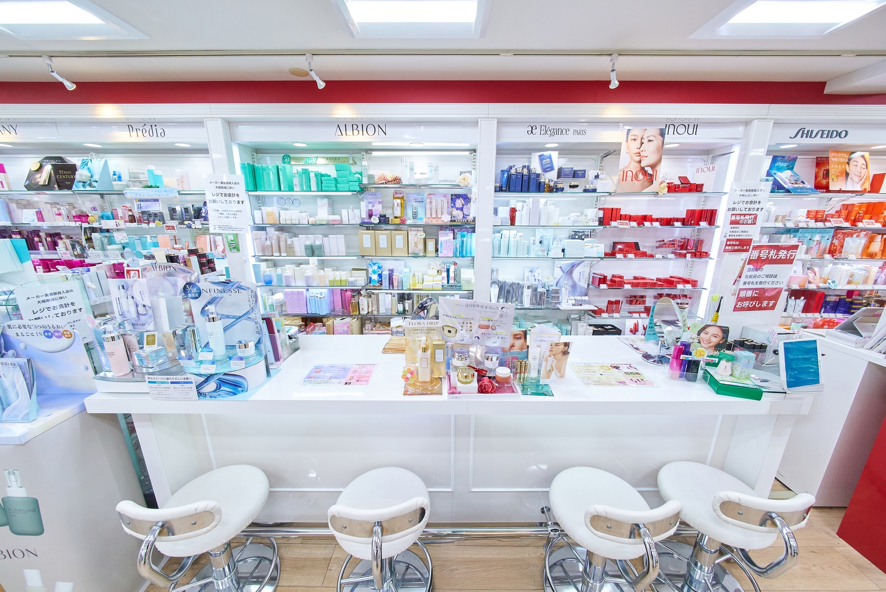 コスメはお店の約半分をしめ、しっかり座っていただけるカウンターやファンデーション、スキンケアの広い売り場が自慢です。メイクは一か所に集めて自由に選んでいただけるようにしました。場所柄OLの方から主婦の方まで幅広いお客様に愛されています。