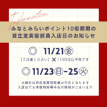 2025/11/20 / 最終更新日 : 2025/11/21 COSMETICS-MEDICAL 84.ランドマークプラザ薬ドラッグハロー ランドマークプラザ店資生堂コーナーより美容部員入店日についてお知らせ 資生堂からみなとみらい10倍期間中の 美容部員入店日のお知らせ みなとみらい10倍の 11月21日金曜、23日日曜~25日火曜まで 各日11時15分ごろ~美容部員が入店しております *入店日でも休憩時間等不 […]